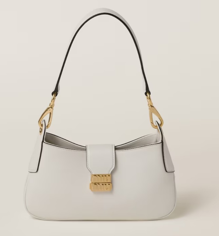 명품 미우미우 핸드백으로 추천드리는 네 번째는 가죽 호보 백입니다. 매끈한 라인의 심플하면서도 모던한 느낌을 주는 가방입니다. 골드 톤의 미우미우 로고와 부드러운 가죽 소재로 포멀한 룩이나 드레스 스타일에도 잘 어울리는 가방 입니다. 클래식하면서 고급스러운 미우미우 스타일의 가방을 찾으시는 여성 분들께 추천드립니다.